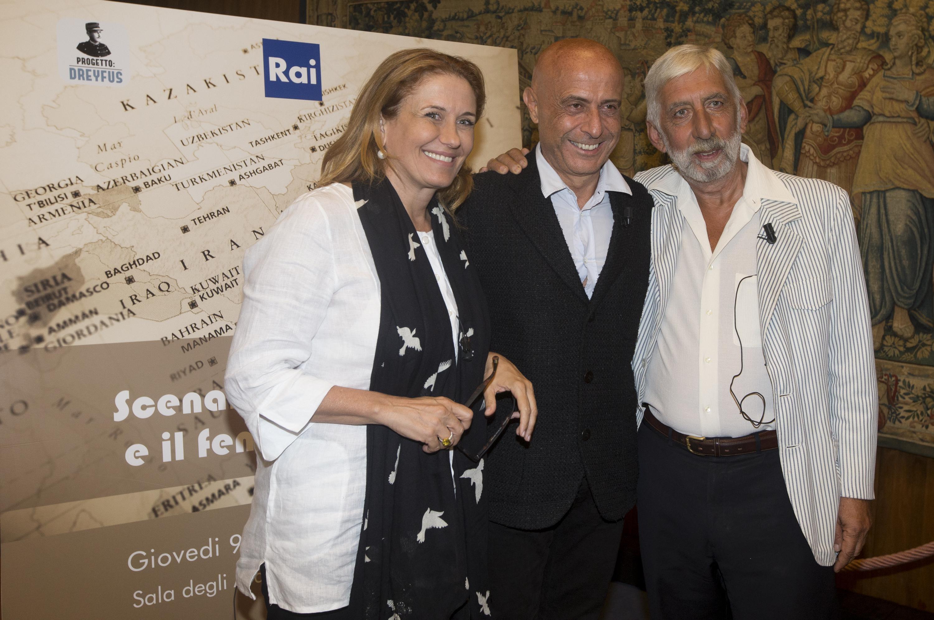 Da sinistra, la giornalista Monica Maggioni, il sottosegretario di Stato alla Presidenza del Consiglio dei ministri, Marco Minniti e il giornalista Carlo Panella durante il dibattito su Scenari mediorientali e il fenomeno Daesh presso la sede RAI di viale Mazzini a Roma, 9 luglio 2015. ANSA/CLAUDIO PERI