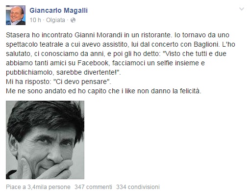 “Stasera ho incontrato Gianni Morandi – scrive Giancarlo Magalli sul suo profilo – Gli ho detto: ‘Visto che tutti e due abbiamo tanti amici su Facebook, facciamoci un selfie insieme e pubblichiamolo, sarebbe divertente!’ Mi ha risposto: ‘Ci devo pensare’. Me ne sono andato ed ho capito che i like non danno la felicità”