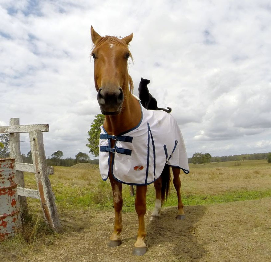 Ogni giorno, il gatto nero sale in groppa al suo amico e dopo qualche strusciata, inizia assieme a lui a gironzolare per i campi.