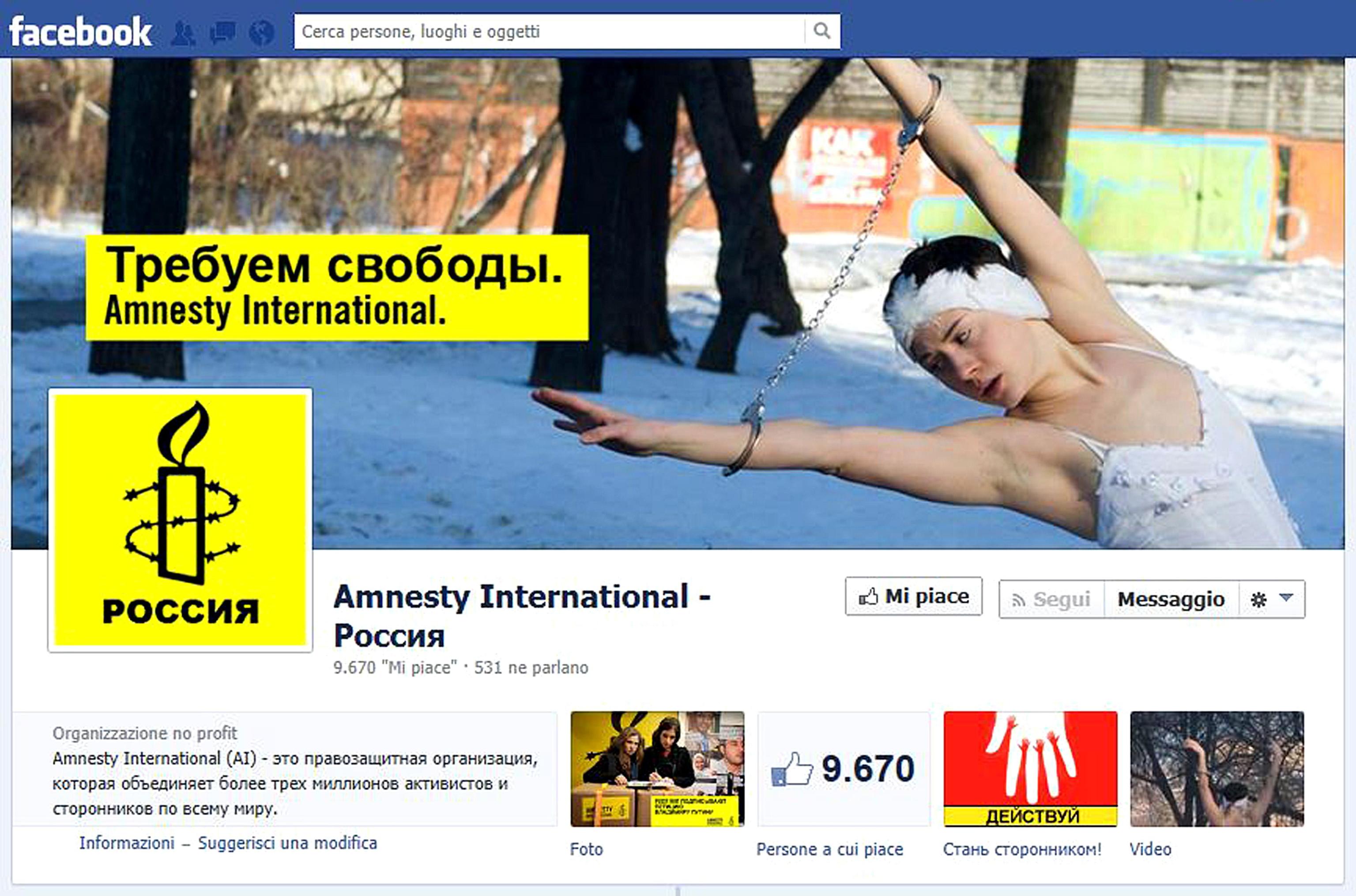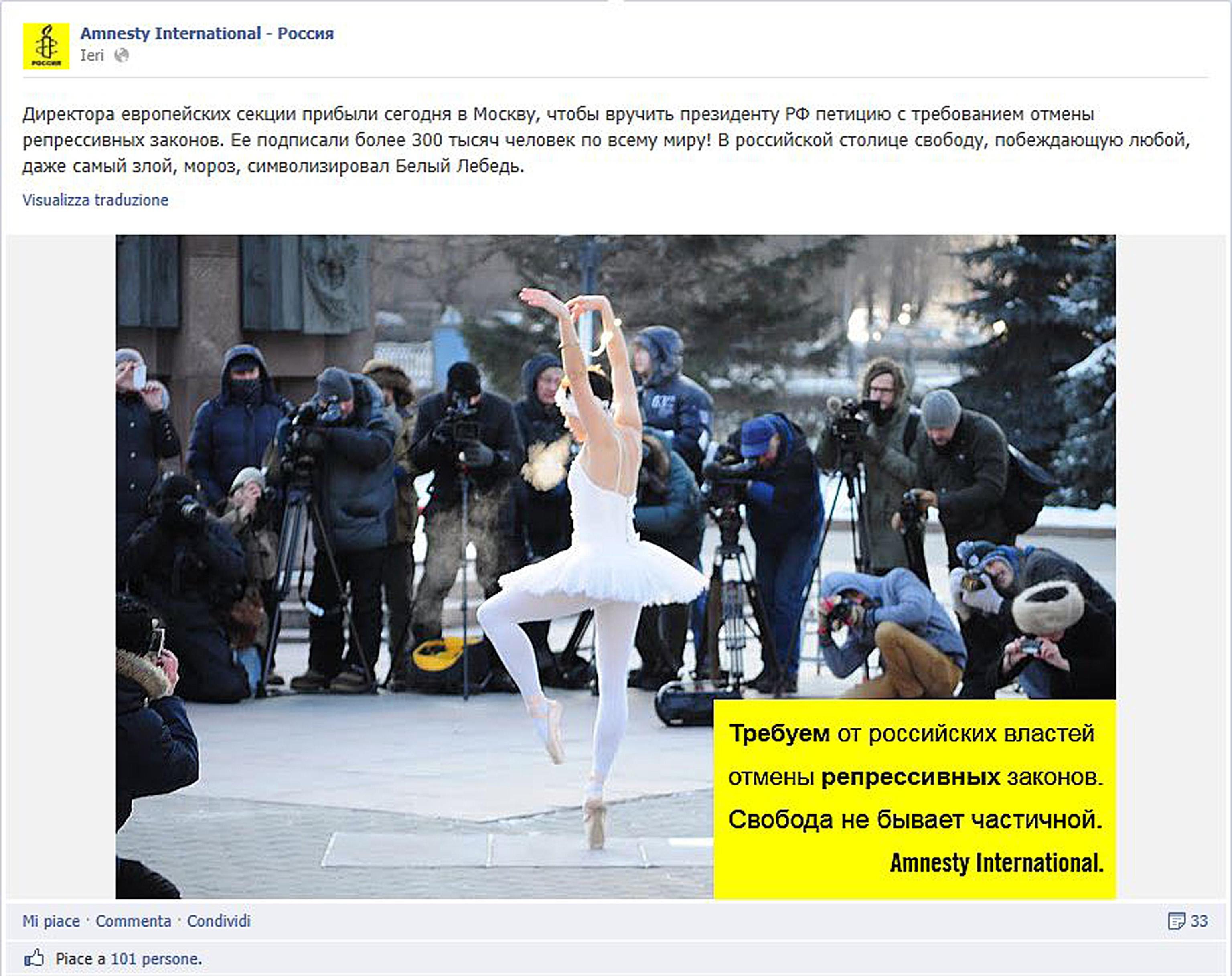La ballerina si esibisce alla vigilia della consegna di una petizione contro le leggi liberticide in Russia, da parte di Amnesty International.