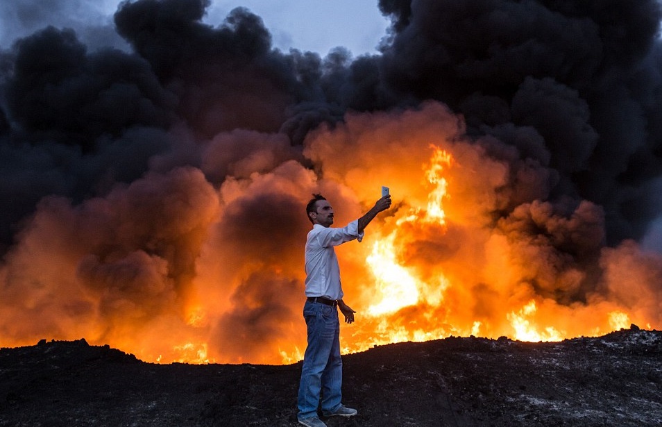 QAYYARAH – Nonostante dietro di lui sia in corso un’esplosione provocata dai feroci combattimenti tra Isis da una parte, iracheni e alleati dall’altra, a Qayyarah, circa 50 chilometri a sud di Mosul in Iraq, un uomo non si trattiene e scatta un selfie accanto alle enormi fiamme.