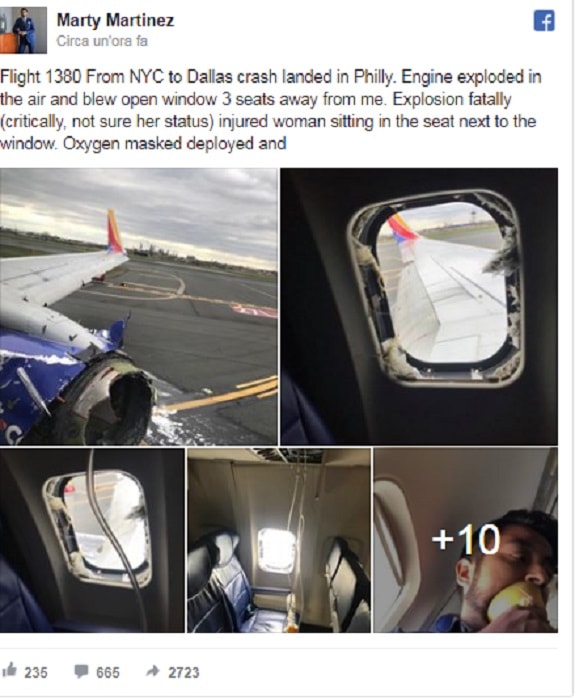 A raccontare la vicenda sono i media americani e britannici che parlano del motore di sinistra del Boeing 737-700. I frammenti hanno colpito e distrutto il finestrino corrispondente al posto in cui era seduta una donna che è stata quasi risucchiata fuori. La donna è stata trattenuta a bordo grazie allo sforzo degli altri passeggeri. Ma non ce l’ha fatta ed è morta per le ferite e lo choc. Si tratta della prima vittima in un incidente riguardante una compagnia aerea Usa dal 2009.
