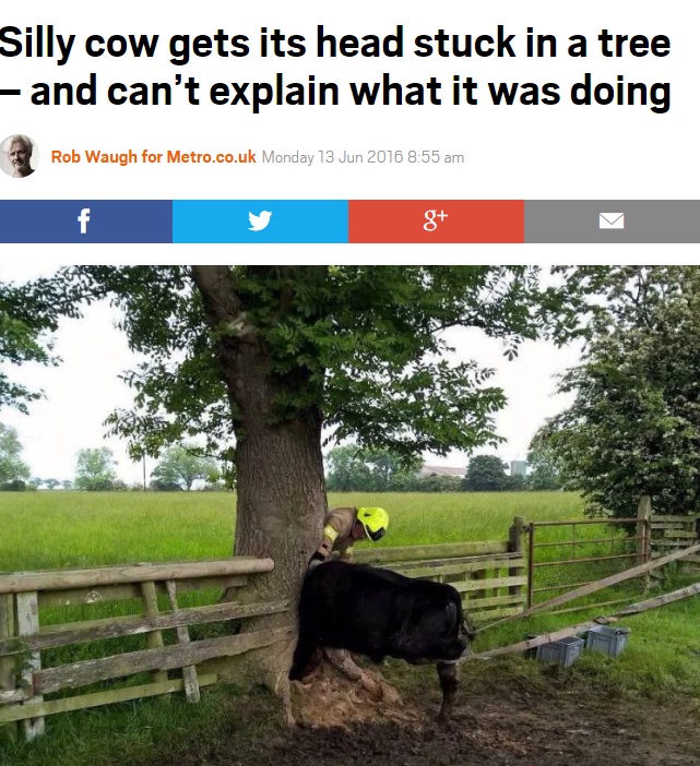 Una mucca sciocca, titola il sito Metro.uk nel riportare la notizia, che di certo fa scattare un sorriso. La povera mucca infatti ha ben deciso di andare a guardare, troppo da vicino, un buco in un albero rimanendo poi con la testa incastrata. Il fattore non è riuscito da solo a liberare il bovino e così ha chiesto aiuto ai vigili del fuoco, che insieme ad un team di veterinari ha liberato la mucca con l’uso di una pressa idraulica e in sicurezza. Un lavoro che ha richiesto ben due ore, con i veterinari che hanno sedato l’animale e i vigili che sono così potuti intervenire in sicurezza. L’animale ora sta bene e a raccontare l’impresa sono gli stessi vigili del fuoco, che su Twitter hanno scritto: