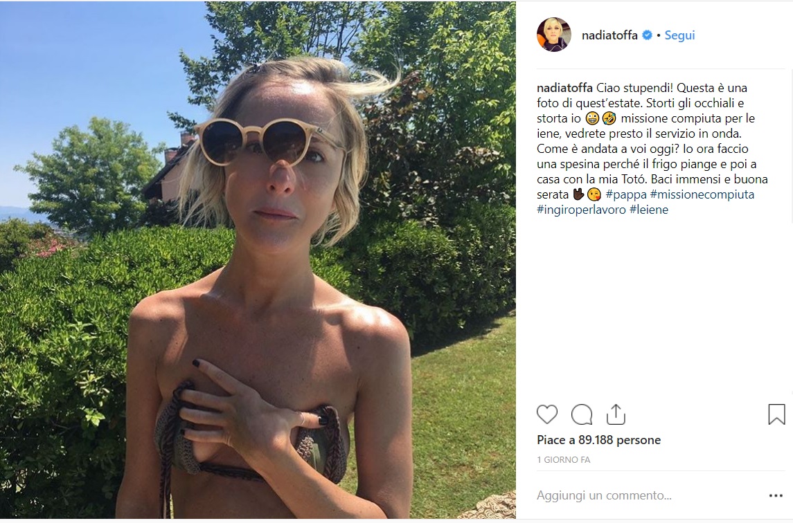 La Iena sta lottando contro un tumore al cervello e ha deciso di regalare ai fan uno scatto divertente e in bikini. Una scelta insolita per Nadia, che non ama mostrarsi senza veli. Una foto che oltre a mostrare un provocante bikini, mostra anche i segni del dimagrimento e una chioma bionda che dopo la chemioterapia sta lentamente ricrescendo.