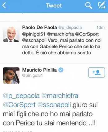 Su Twitter l’attaccante cileno ha negato tutto e ha detto di non aver mai parlato con i giornalisti del Corriere dello Sport. Poco dopo è arrivata la risposta del direttore De Paola: “Vero, mai parlato con noi ma con Gabriele Perico che ce lo ha detto. È ciò che abbiamo scritto”. La replica di Pinilla: “Mai parlato con Perico, lo giuro sui miei figli”.