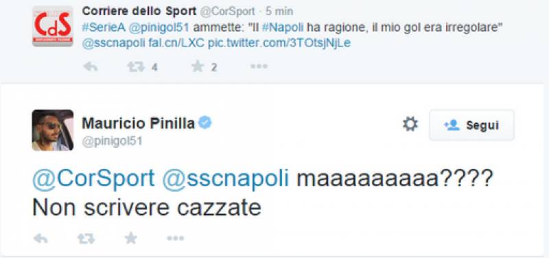 ROMA – Mauricio Pinilla, attaccante dell’Atalanta, è stato protagonista di un botta e risposta col direttore del Corriere dello Sport Paolo De Paola. Tutto è legato a un articolo del quotidiano sportivo in cui si parla della “confessione” di Pinilla, che avrebbe ammesso all’ex Cagliari Gabriele Perico l’irregolarità del gol di domenica scorsa contro il Napoli.