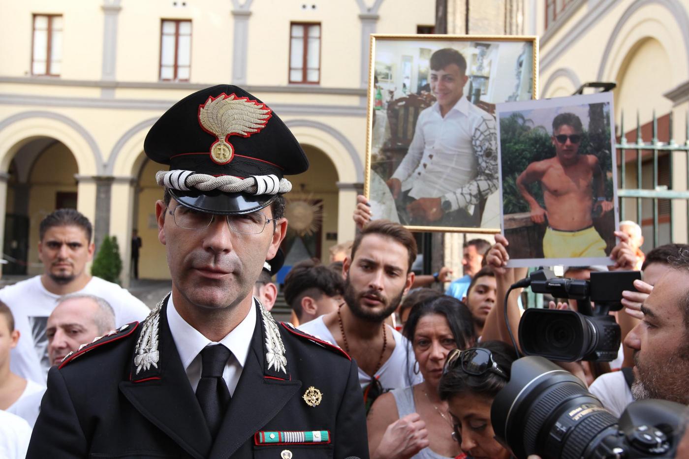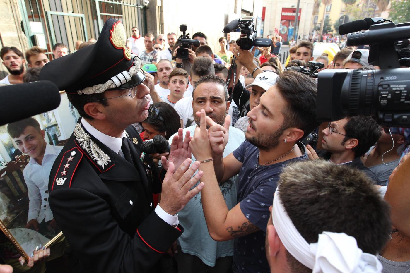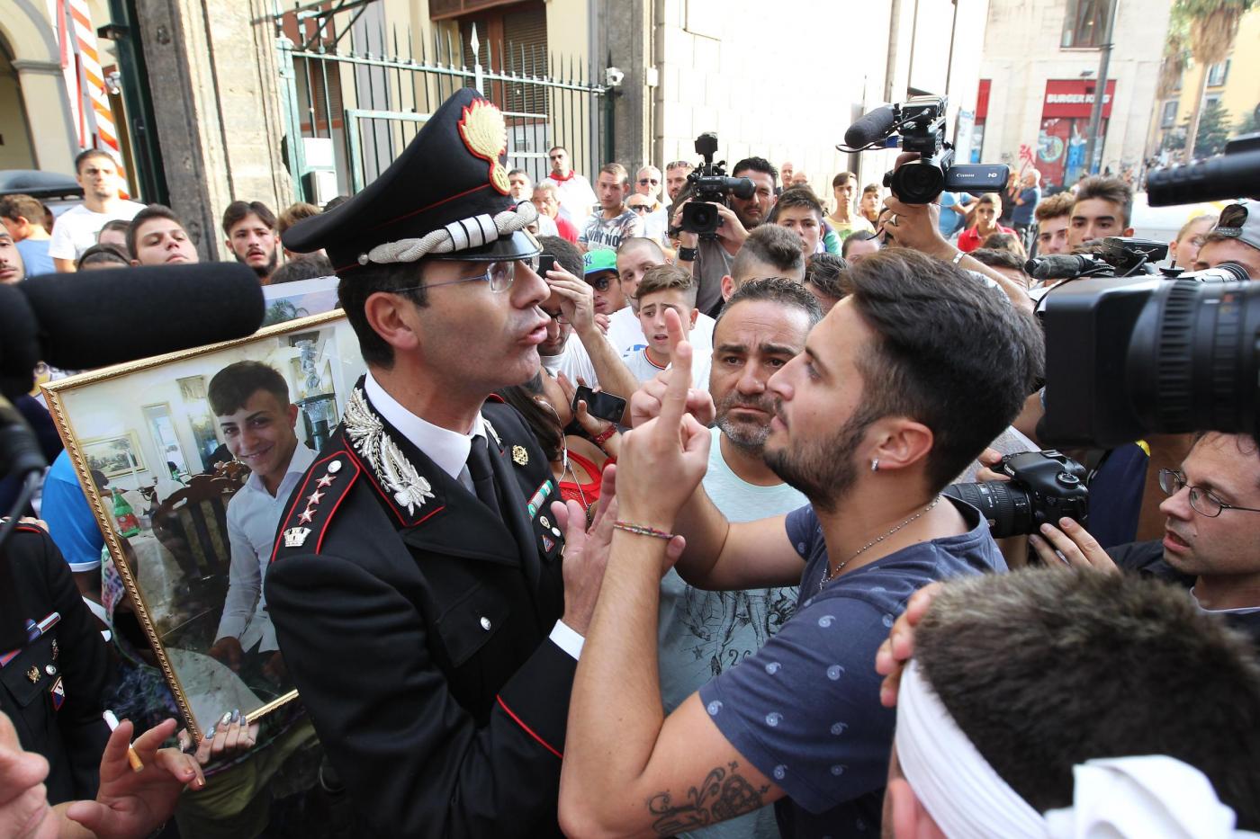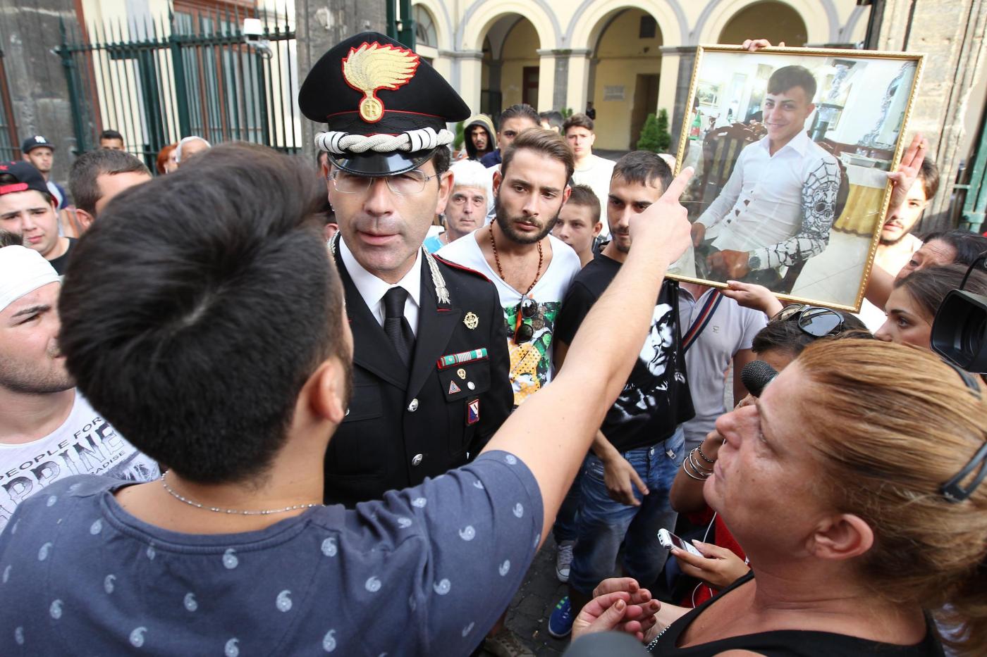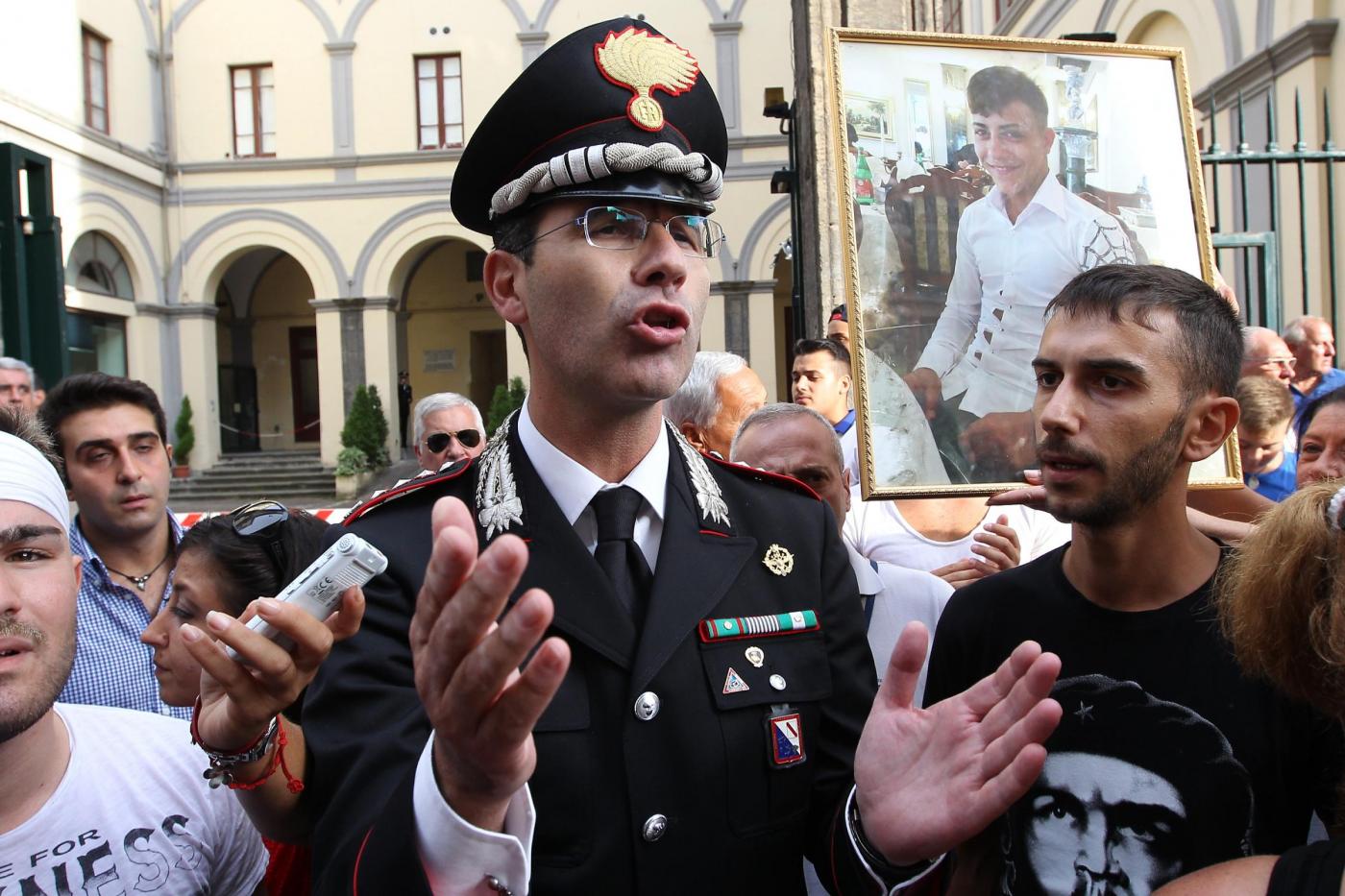 NAPOLI – Un dialogo di qualche minuto tra alcuni manifestanti e il comandante provinciale dei carabinieri, Marco Minicucci, che poi si toglie per qualche secondo il cappello rispettando così il minuto di silenzio. E’ quanto accade al passaggio del corteo per Davide Bifolco, il ragazzo di 17 anni ucciso dal colpo sparato da un carabiniere la notte di venerdì 5 settembre, davanti alla caserma ‘Pastrengo’ dei carabinieri a Napoli. “Non è uno scontro tra noi e voi – dice Minicucci rispondendo alla richiesta di giustizia del cugino di Davide, Gianni – ma una lotta comune per la legalità. La magistratura accerterà la verita’”.