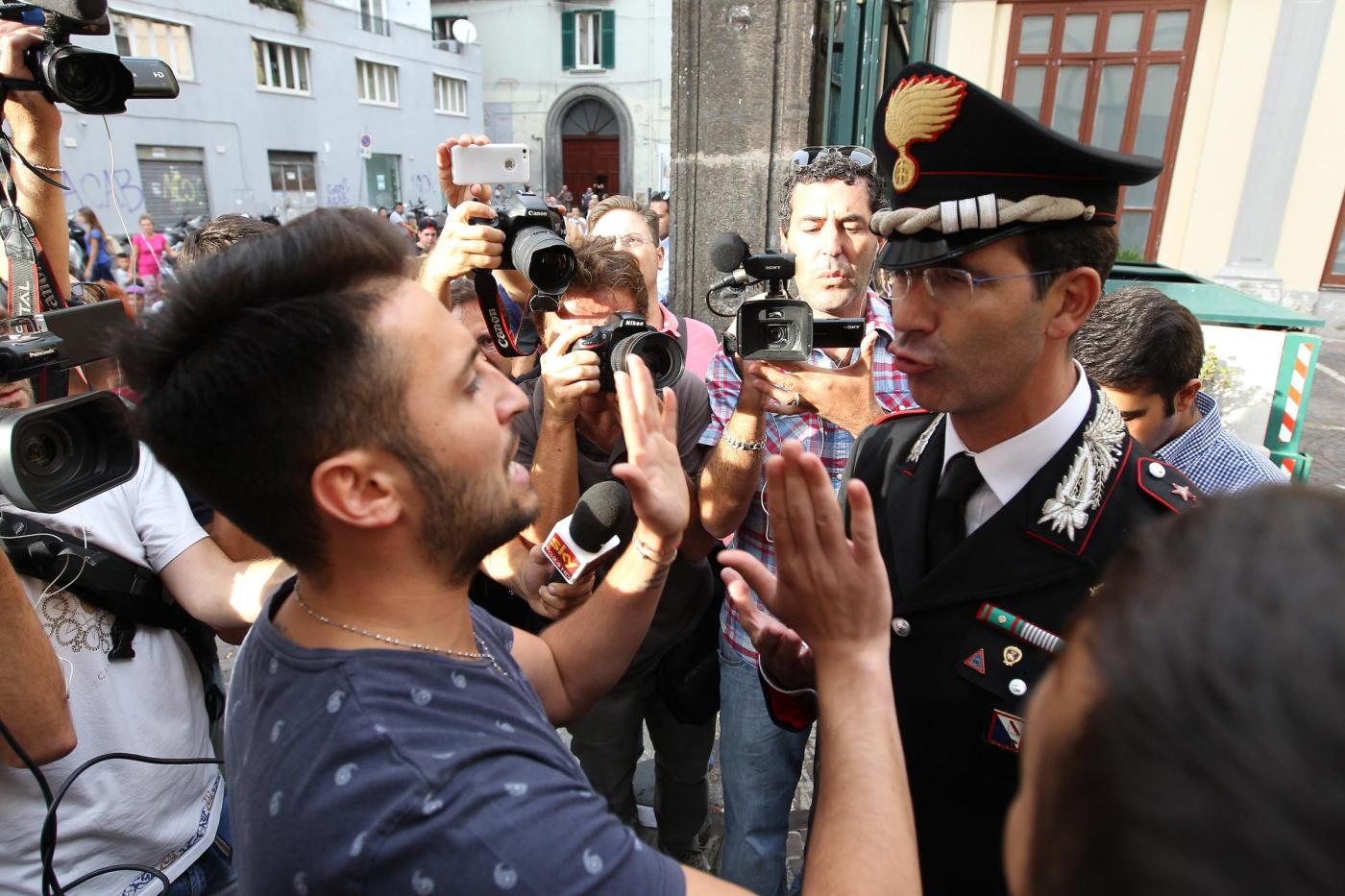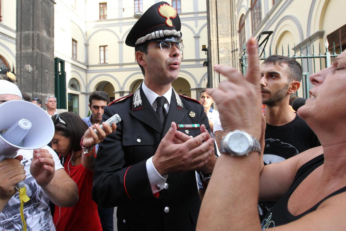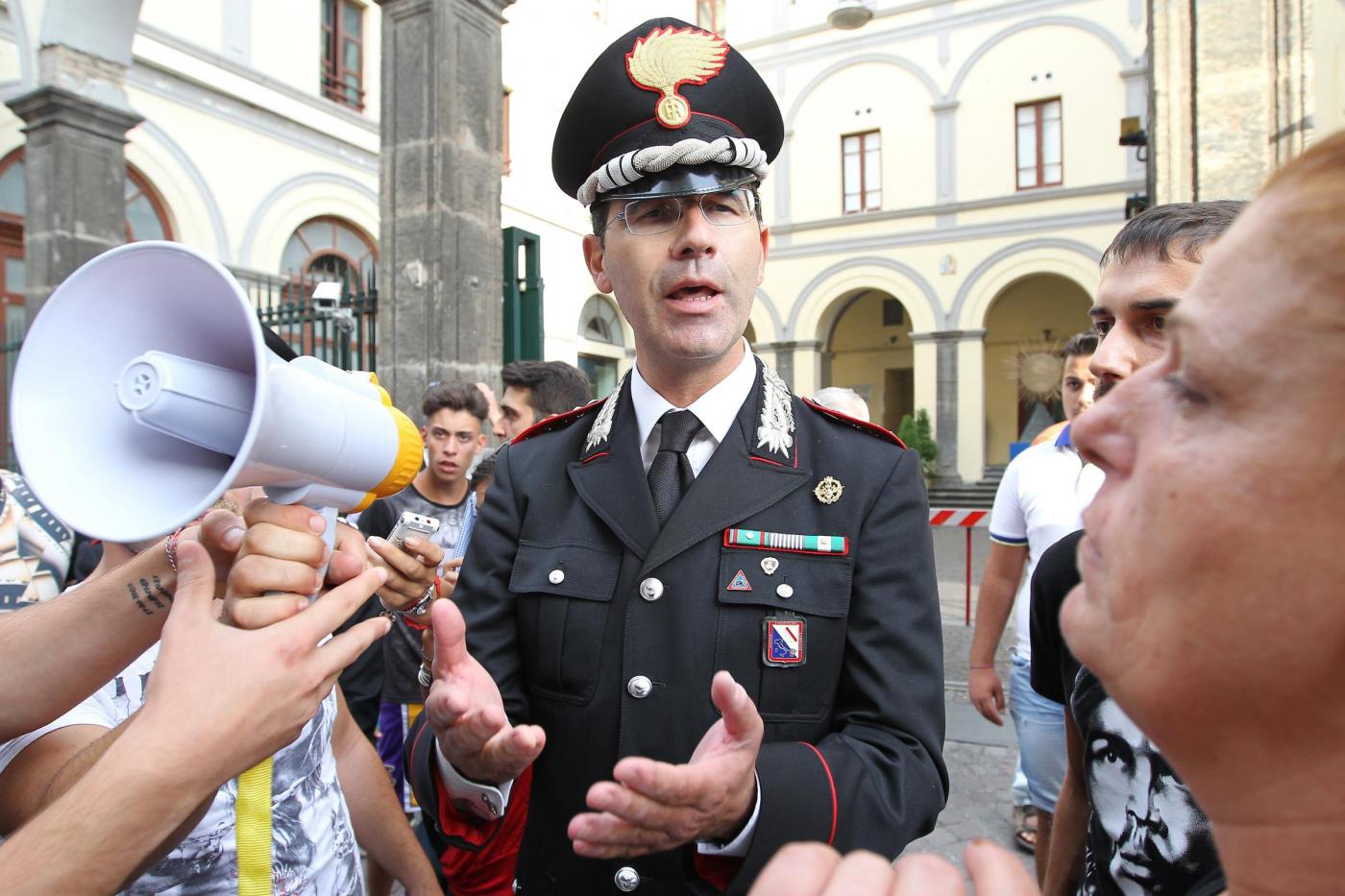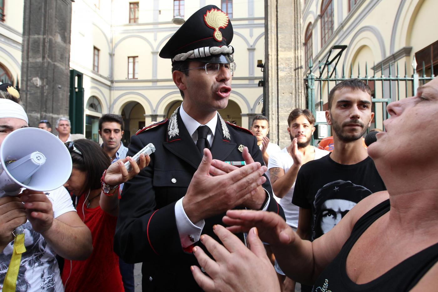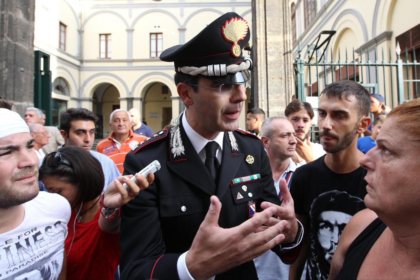 NAPOLI – Un dialogo di qualche minuto tra alcuni manifestanti e il comandante provinciale dei carabinieri, Marco Minicucci, che poi si toglie per qualche secondo il cappello rispettando così il minuto di silenzio. E’ quanto accade al passaggio del corteo per Davide Bifolco, il ragazzo di 17 anni ucciso dal colpo sparato da un carabiniere la notte di venerdì 5 settembre, davanti alla caserma ‘Pastrengo’ dei carabinieri a Napoli. “Non è uno scontro tra noi e voi – dice Minicucci rispondendo alla richiesta di giustizia del cugino di Davide, Gianni – ma una lotta comune per la legalità. La magistratura accerterà la verita’”.