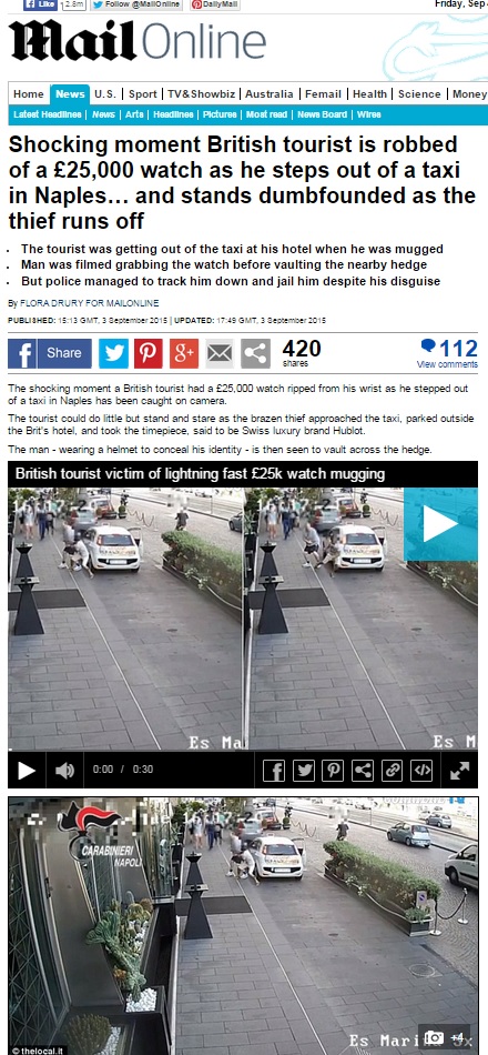 NAPOLI – E’ finito sul Daily Mail il video dello scippo in diretta di un orologio da 35mila euro ai danni di un turista inglese. E’ accaduto qualche giorno fa a Napoli, città che il quotidiano britannico non esita ad etichettare come “a city better known for its link to the mafia” (una città meglio conosciuta per i suoi collegamenti con la mafia). I carabinieri sono riusciti poi a rintracciare lo scippatore grazie alle immagini girate dalle telecamere di sorveglianza: nel video si vede la vittima arrivare in taxi dinanzi ad un grande albergo e il rapinatore che si avventa contro di lui e gli strappa l’orologio dal polso appena sceso dall’auto.