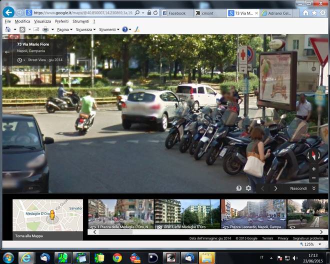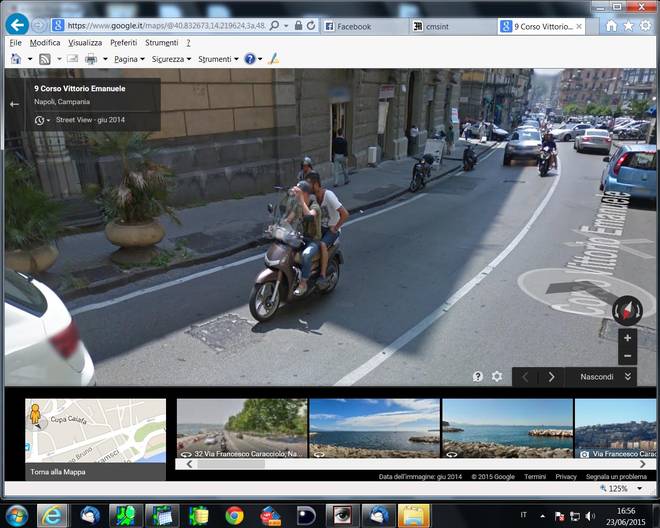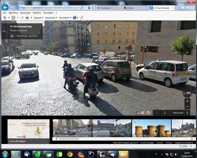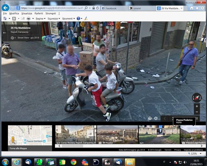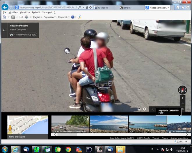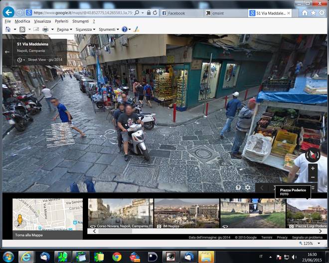 “Chiosa numero uno: è vero, Google Maps a Napoli mostra anche centinaia di bellezze e migliaia di centauri che il casco lo indossano ma non ne parliamo perché ci sembra assolutamente normale che, nel 2015, si vada in ciclomotore con il casco. Chiosa numero due dedicata a quelli che «anche le altre città sono così, voi volete solo sputtanare Napoli»: abbiamo provato a girovagare con la stessa modalità anche per le strade di Roma e di Milano. Nella capitale siamo stati capaci di trovare solo un centauro senza casco, a Milano nessuno. Ma potremmo essere stati superficiali, se avete notizie più approfondite mandatecele, per piacere. Torniamo, però, al giro turistico napoletano. Se pensate che l’illegalità sia stata scovata solo nei quartieri periferici vi sbagliate di grosso. Come vedete anche nelle fotografie pubblicate in questa pagina, non c’è quartiere di Napoli nel quale non siano state immortalate situazioni limite: dal Vomero alla Duchesca, da Chiaia a Forcella, dal Corso Vittorio Emanuele a Soccavo, ovunque spunta un napoletano strafottente che se ne infischia della legge. Ovviamente la situazione illegale più diffusa è legata all’utilizzo dei mezzi a due ruote. Abbondano le immagini di persone senza casco, di motorini schiacciati dal peso di tre (a volte quattro) persone, di scooter che viaggiano contromano o in zone vietate. Innumerevoli i casi di auto in sosta in doppia fila, decine le riprese (bisogna puntare il mouse verso l’alto) di cantieri nei quali non si rispettano le norme di sicurezza. Google, per rispettare la privacy, oscura il volto di ogni persona ripresa dalla telecamera speciale: i protagonisti di questa galleria degli orrori, però, si riconosceranno. Magari proveranno anche un po’ di vergogna, speriamo…”