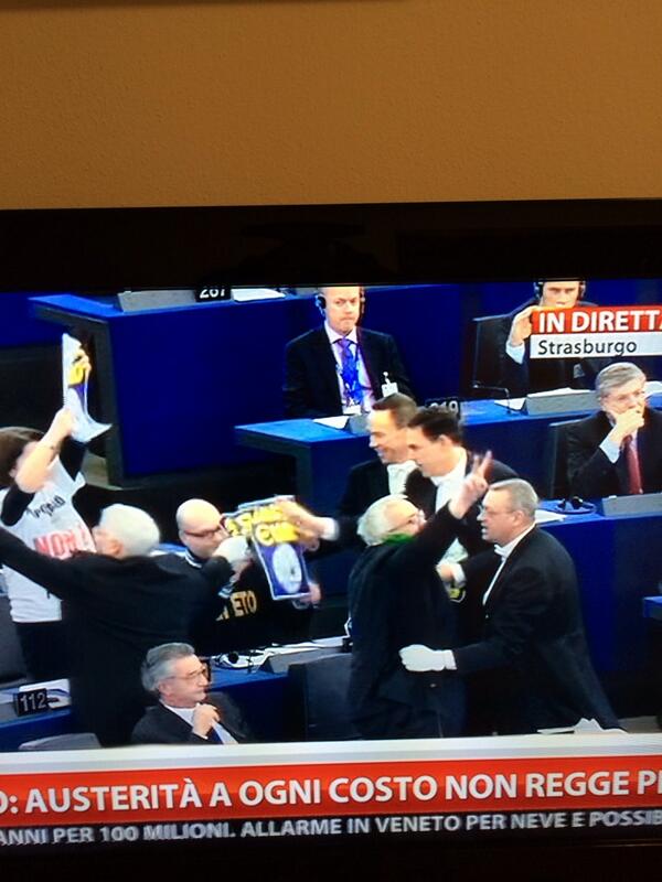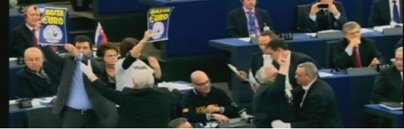 STRASBURGO – “Non regge più la politica di austerità a ogni costo”, dice al parlamento europeo il presidente della Repubblica Giorgio Napolitano. Ma durante il suo discorso gli eurodeputati della Lega Nord, guidati da Matteo Salvini, hanno fatto irruzione e protestato contro l’Euro. Un gesto che è stato fischiato dall’Europarlamento, che ha condannato i comportamenti leghisti a Strasburgo.