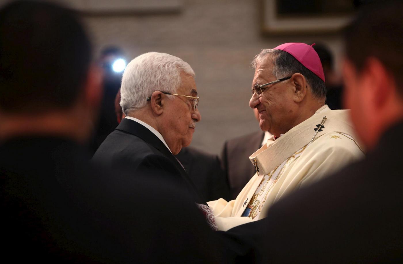 Palestinian President Mahmoud Abbas (L) greets Latin Patriarch of Jerusalem Fouad Twal during a Christmas midnight mass at the Church of the Nativity in the West Bank town of Bethlehem December 25, 2014. REUTERS/Fadi Arouri/Pool