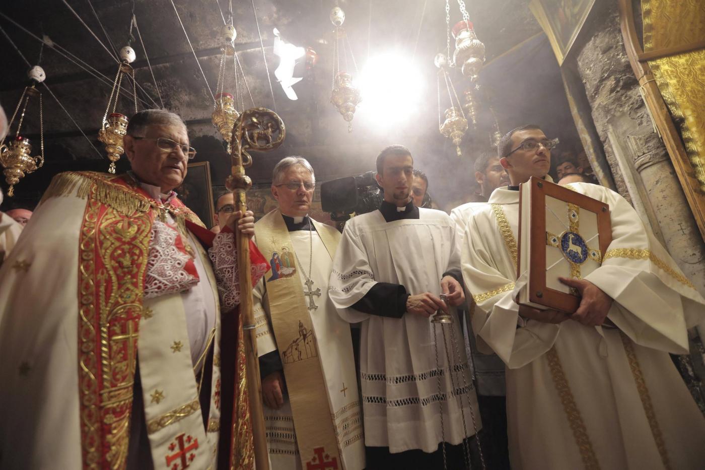 Latin Patriarch of Jerusalem Fouad Twal (L) leads a Christmas midnight mass at the Church of the Nativity in the West Bank town of Bethlehem December 25, 2015. REUTERS/Fadi Arouri/Pool