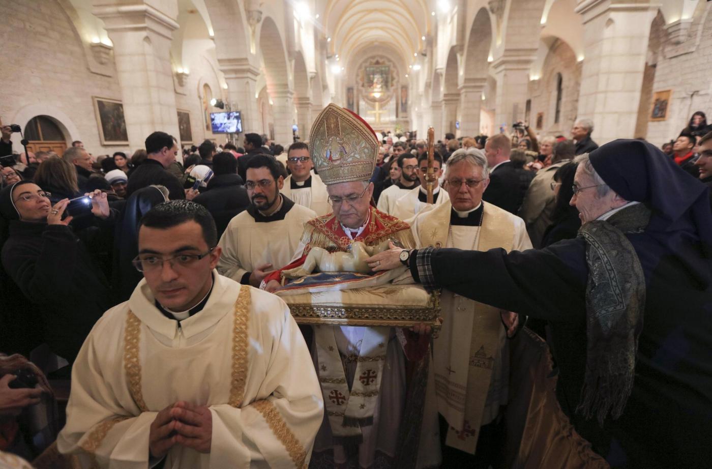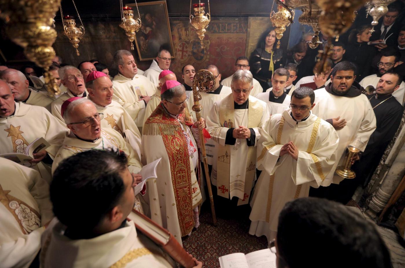 Latin Patriarch of Jerusalem Fouad Twal leads a Christmas midnight mass at the Church of the Nativity in the West Bank town of Bethlehem December 25, 2015. REUTERS/Fadi Arouri/Pool