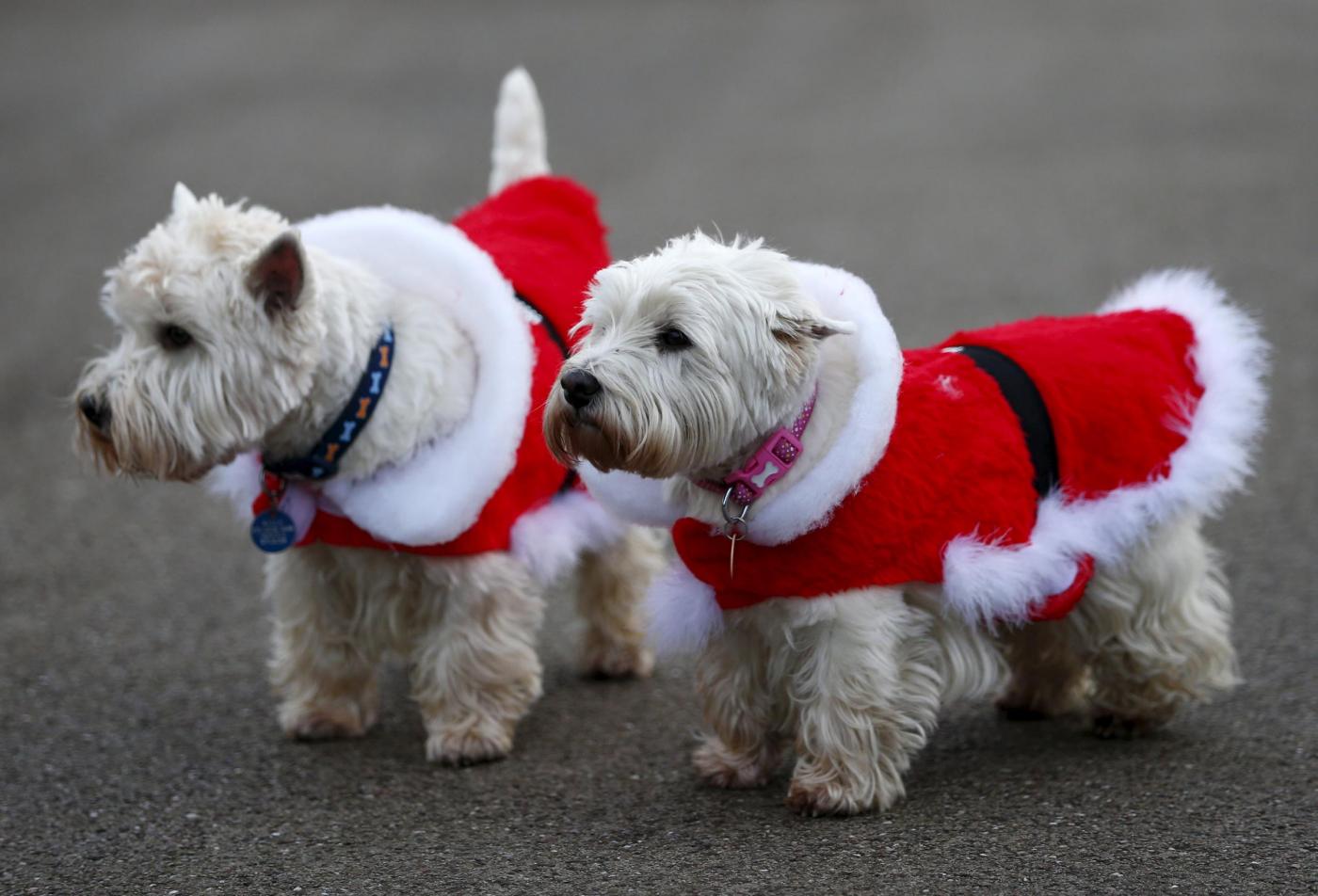 Two Scottish Terriers wear Christmas themed coats as they join their owners to watch the annual Christmas Day Peter Pan Cup handicap swimming race in the Serpentine River, in Hyde Park, London, December 25, 2015. REUTERS/Andrew Winning