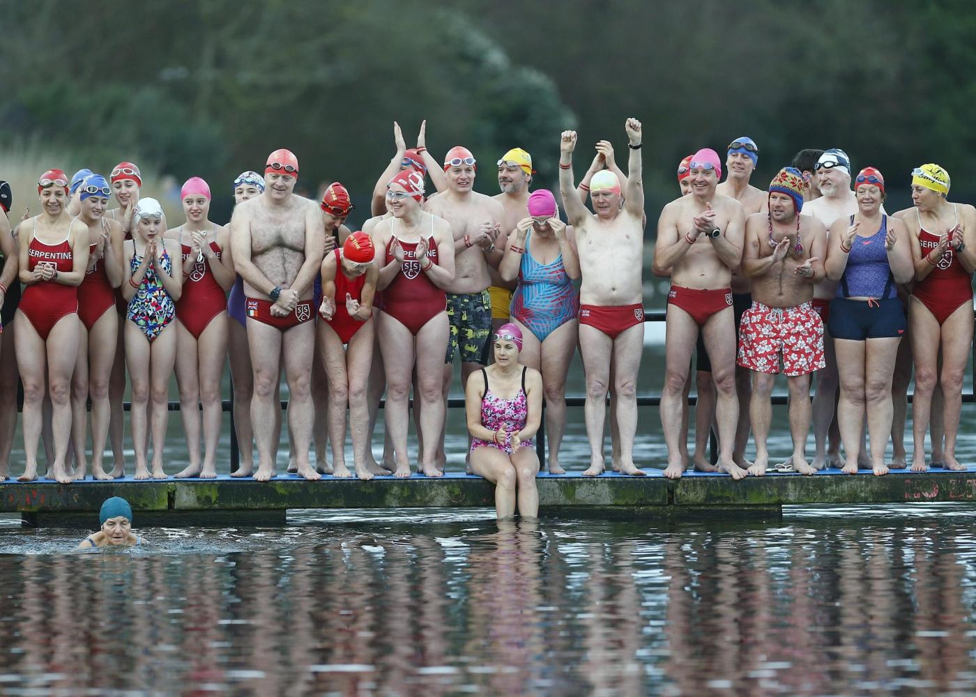 Swimmers cheer as the first participant begins the annual Christmas Day Peter Pan Cup handicap race in the Serpentine River, in Hyde Park, London, December 25, 2015. REUTERS/Andrew Winning
