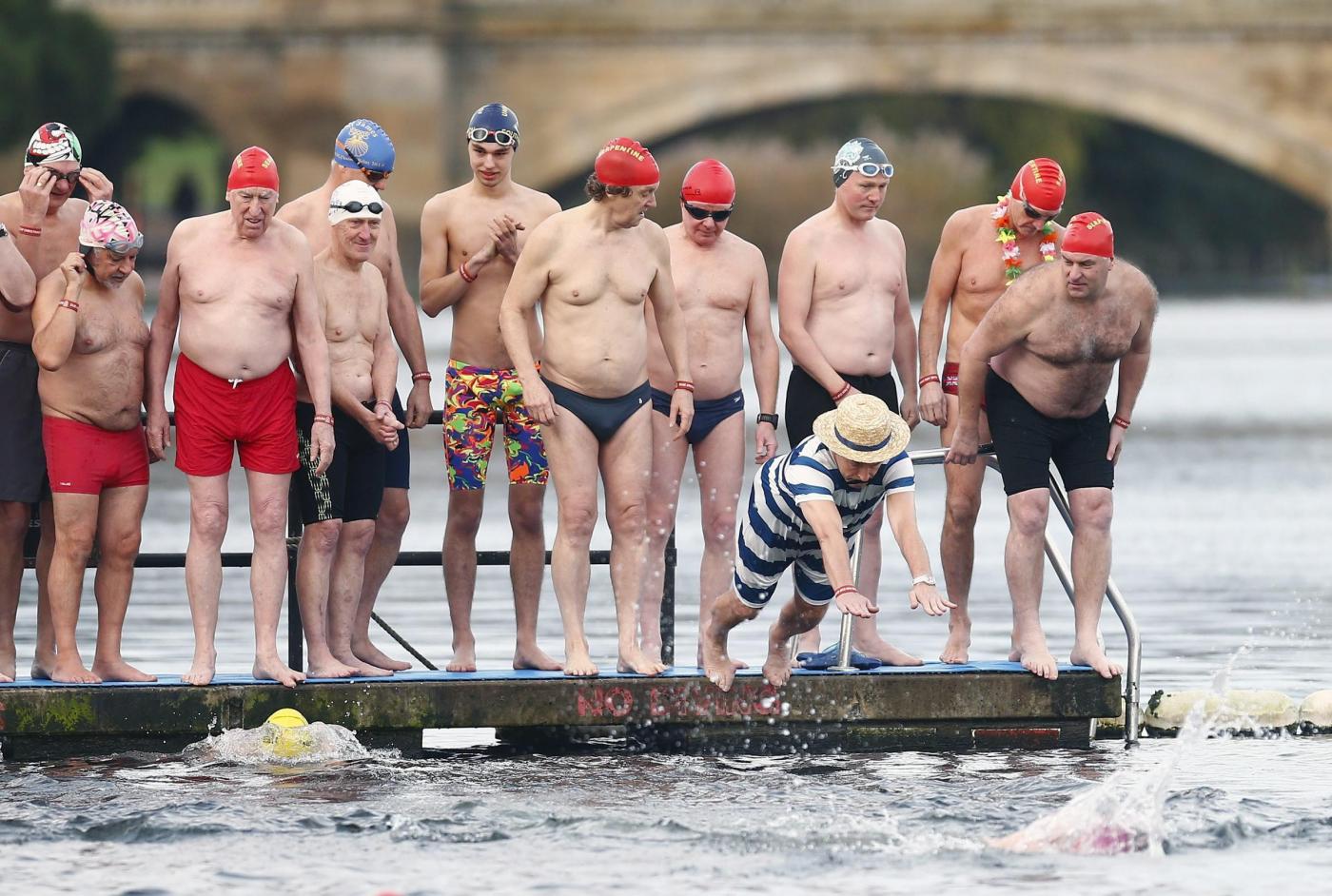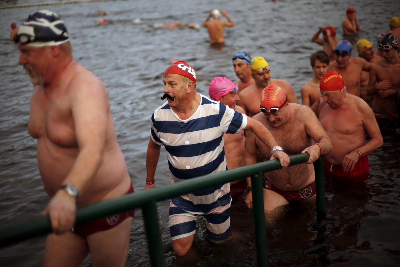 Swimmers start in the annual Christmas Day Peter Pan Cup handicap race in the Serpentine River, in Hyde Park, London, December 25, 2015. REUTERS/Andrew Winning