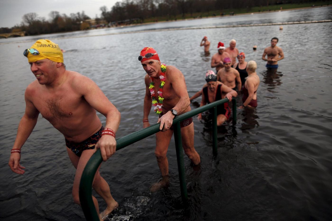 Swimmers climb out after taking part in the annual Christmas Day Peter Pan Cup handicap race in the Serpentine River, in Hyde Park, London, December 25, 2015. REUTERS/Andrew Winning