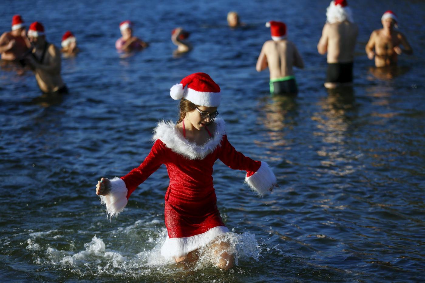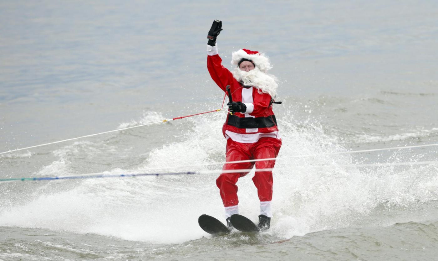 Stessa tradizione, ma località diversa e temperature solo di poco più miti per i londinesi che si esibiscono nella nuotata di Natale della “Coppa Peter Pan” nel fiume Serpentine ad Hyde Park. In Virginia, nel fiume Potomac, i virtuosi dello sci d’acqua si esibiscono vestiti da Babbo Natale.