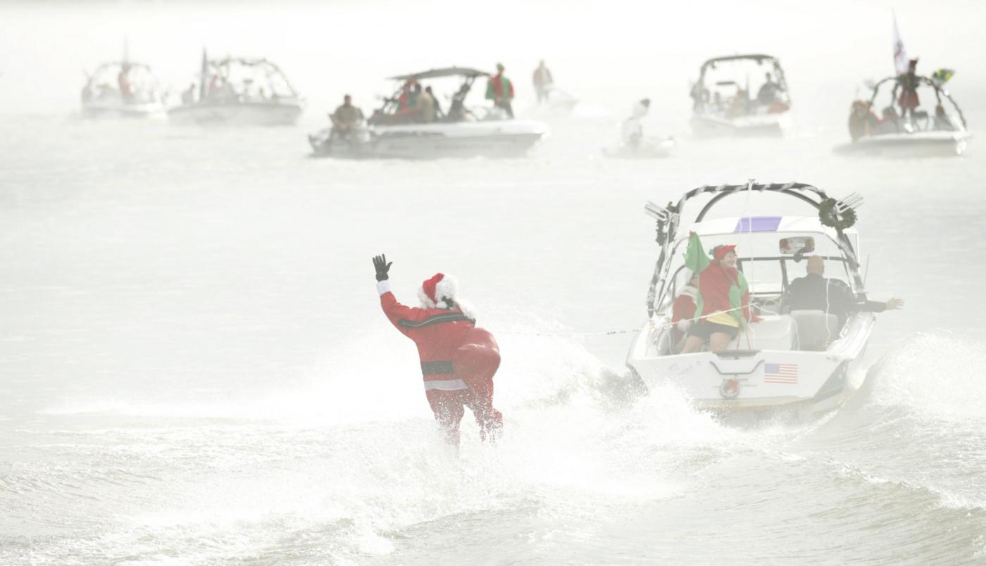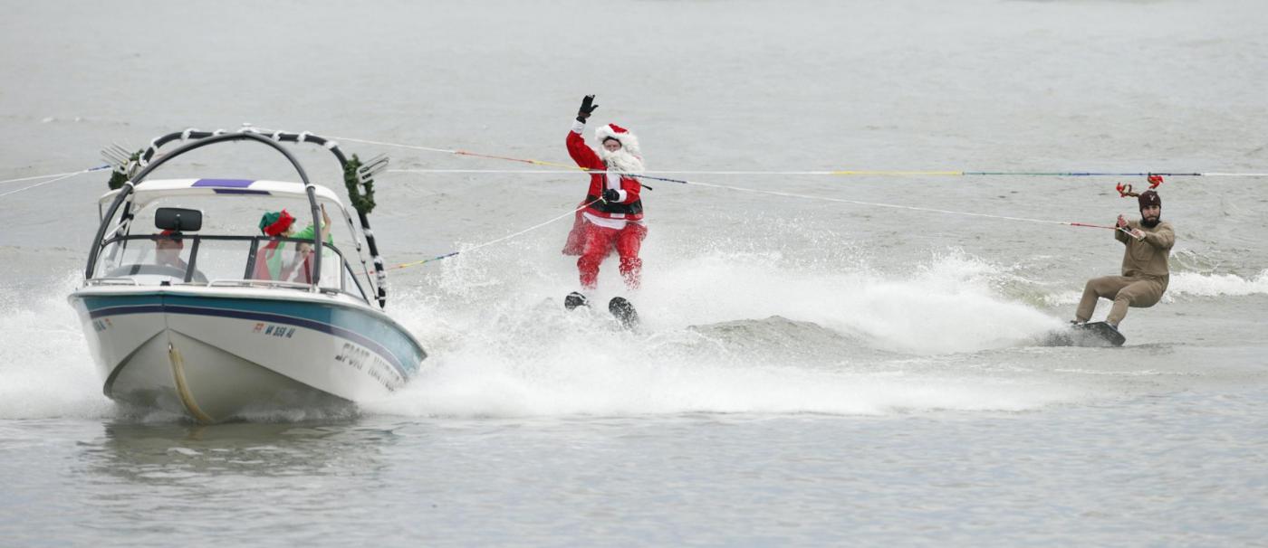 A man dressed as Santa Claus waves to the crowd as he water skis on the Potomac River in Alexandria, Virginia, on Christmas Eve December 24, 2015. REUTERS/Kevin Lamarque