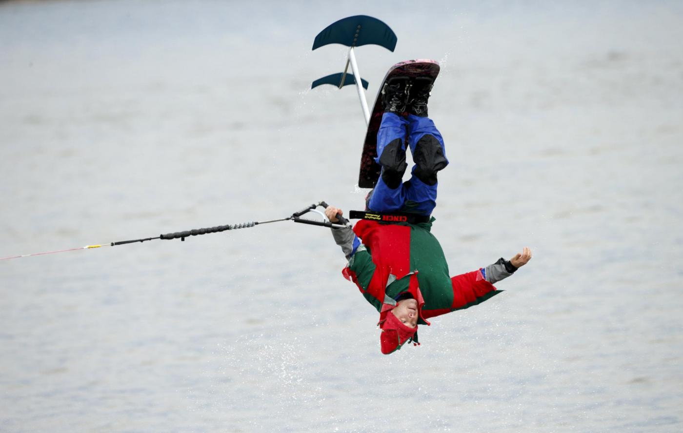 A man dressed as Christmas elf does a flip while taking part in a Christmas Eve water skiing show on the Potomac River in Alexandria, Virginia, December 24, 2015. REUTERS/Kevin Lamarque