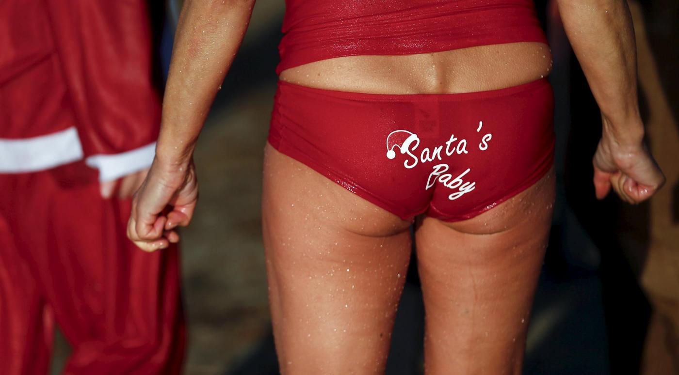A visitor to Sydney’s Bondi Beach wears a Santa suit as thousands of tourists flock to the popular seaside attraction on Christmas Day, December 25, 2015. REUTERS/Jason Reed