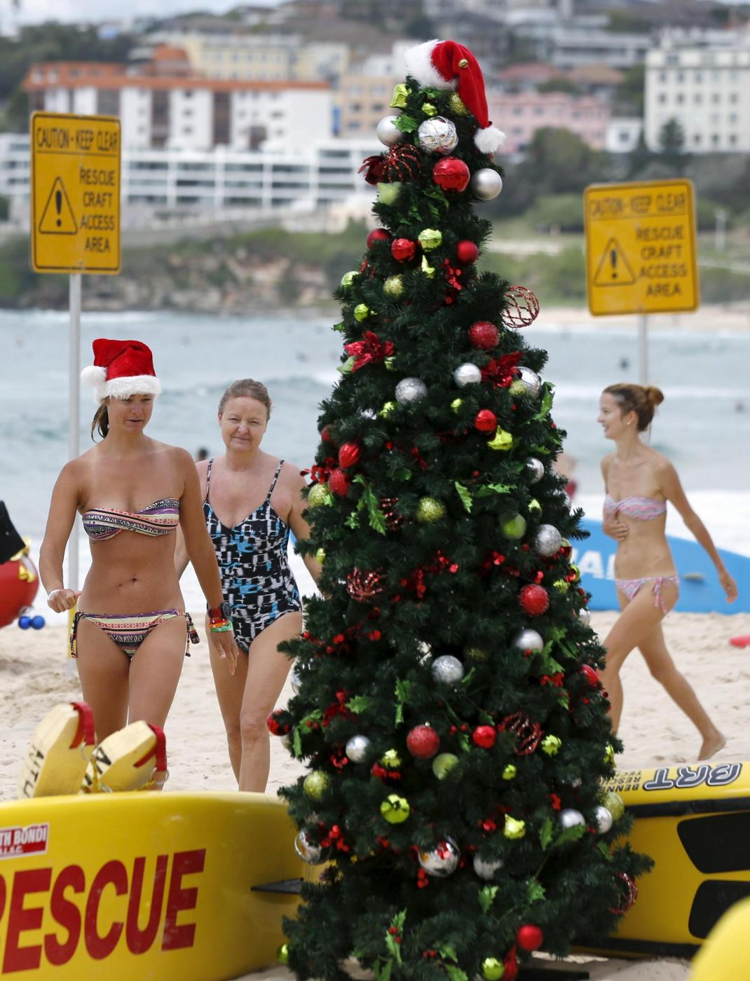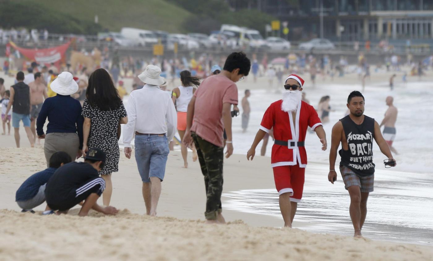 Tourists wearing Santa hats and Australian flag-inspired bikinis walk along Sydney’s Bondi Beach as they celebrate Christmas Day, December 25, 2015. REUTERS/Jason Reed