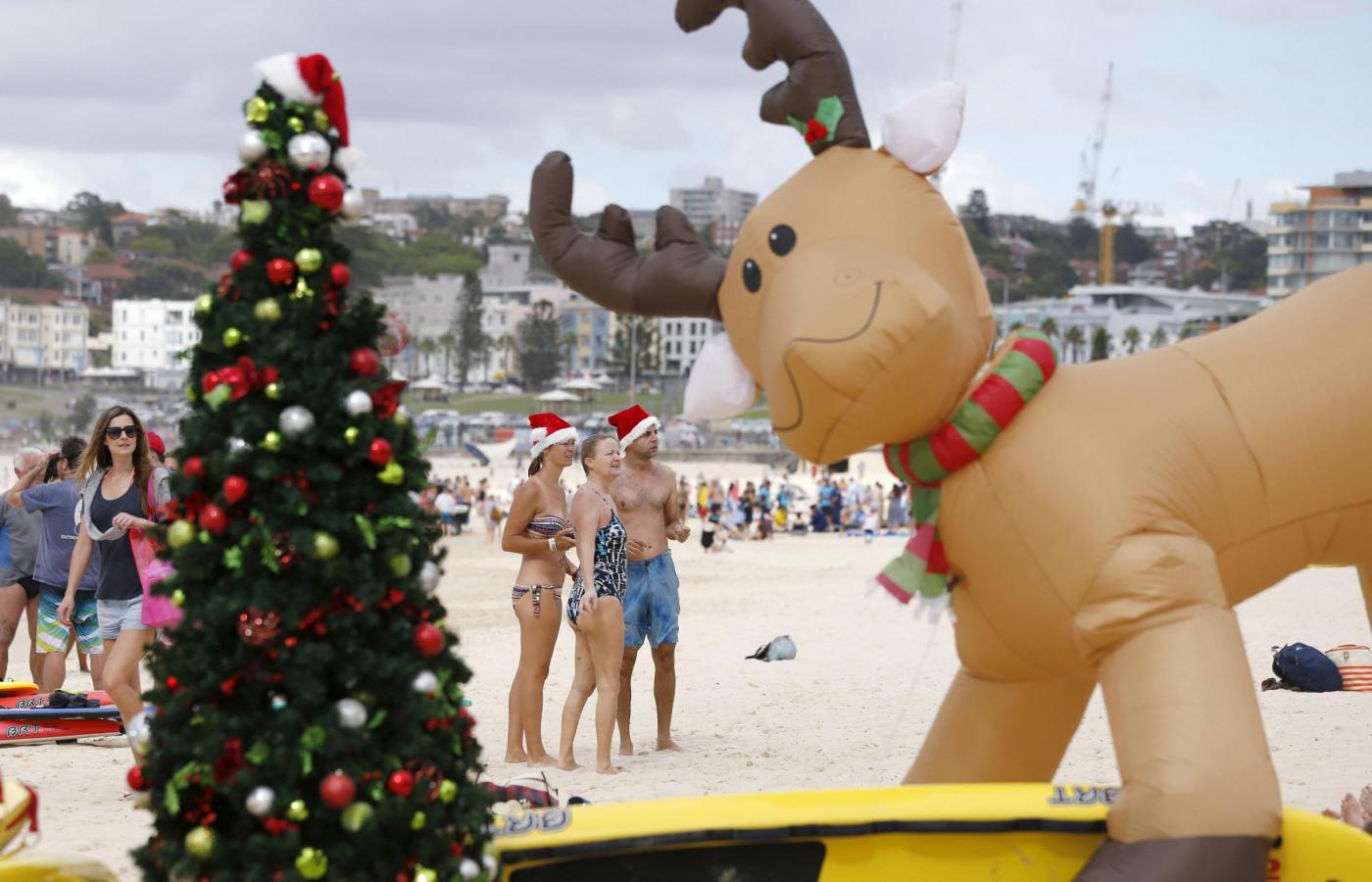 Visitors to Sydney’s Bondi Beach look at an inflatable reindeer and decorated Christmas tree set up by surf lifesavers as they celebrate Christmas Day, December 25, 2015. REUTERS/Jason Reed