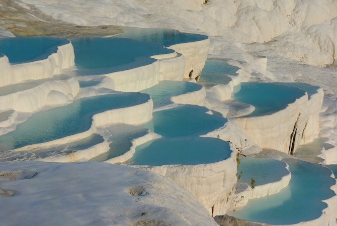 Fin dall’antichità le piscine naturali di travertino di Pamukkale, in Turchia, sono state considerate un luogo speciale e sacro. In effetti, queste enormi terrazze bianche sembrano irrealistici cumuli di neve in mezzo all’arida campagna dell’entroterra della Turchia, visibili già a chilometri di distanza”.