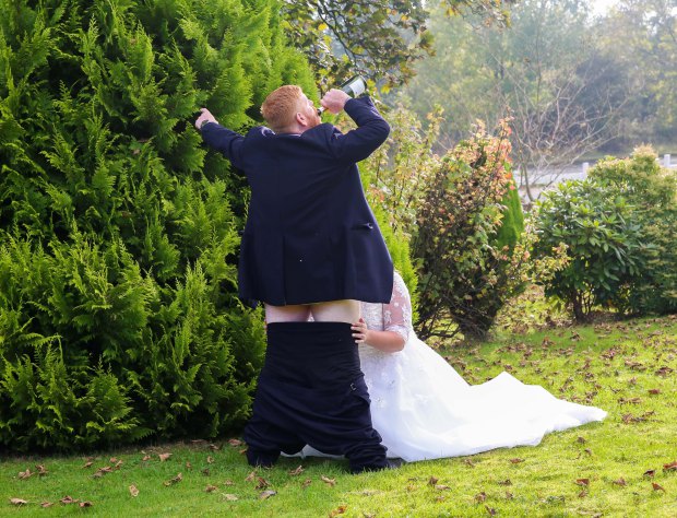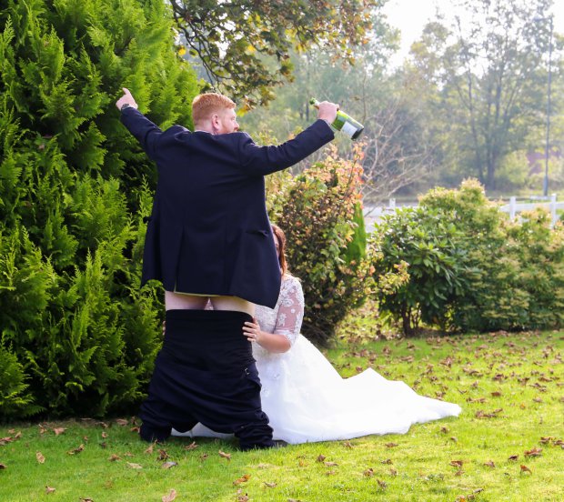 Con la bottiglia in mano, Gareth si è abbassato i pantaloni. La moglie si è inginocchiata davanti a lui e, con il volto coperto dal corpo del marito ha simulato un rapporto orale. Il fotografo è stato allo scherzo ed ha scattato una foto riprendendo la coppia dalle spalle di lui.