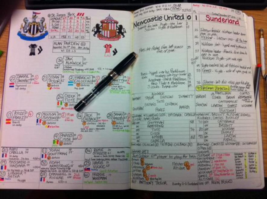 Nick Barnes su Twitter ha mostrato il quadernone dove, con una precisione maniacale degna del miglior tifoso di calcio, annota tutti i dettagli prima, durante e dopo la partita che dovrà commentare. “La pagina a sinistra – racconta Nick – è dedicata a tutti i dettagli delle squadre avversarie al Sunderland: formazioni, risultati, curiosità. La facciata destra invece la compilo al momento, annotando tutti i dati relativi allo svolgimento della partita”. (foto Twitter).