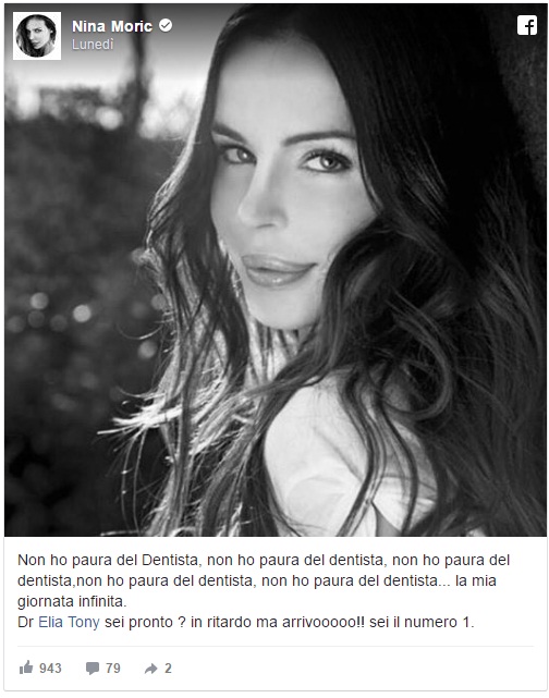 ROMA – “Non ho paura del Dentista, non ho paura del dentista, non ho paura del dentista, non ho paura del dentista, non ho paura del dentista…la mia giornata infinita”. Nina Moric lo ripete all’infinito sulla sua bacheca Facebook per farsi forza, poco prima di una visita dal temutissimo dentista. Poi tagga anche il medico: “Dr Elia Tony sei pronto? in ritardo ma arrivooooo!! sei il numero 1″.