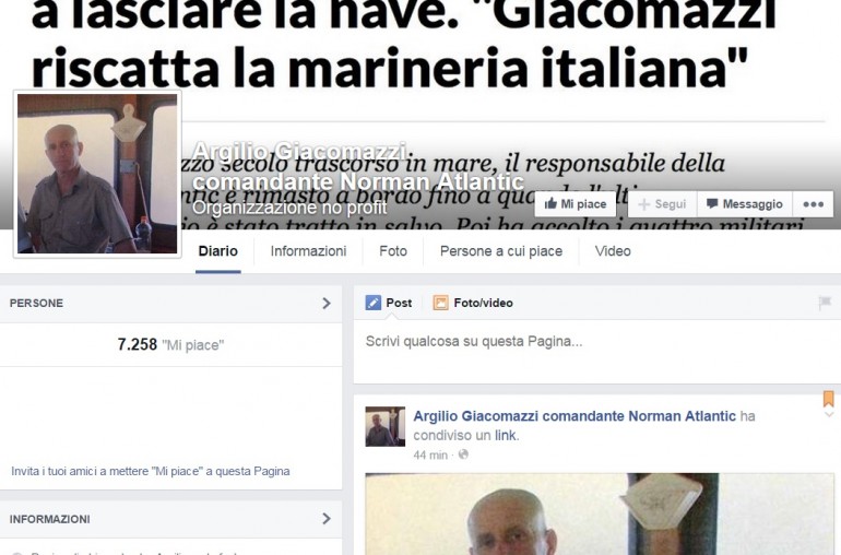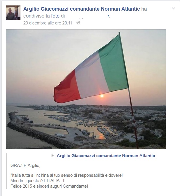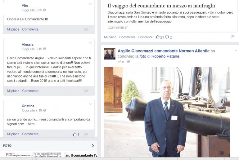 BARI – “Forza Argilio, non mollare”, ” Grande comandante! Schettino guarda e impara!”: Argilio Giacomazzi come l’anti-Francesco Schettino. Il comandante della Norman Atlantic, il traghetto che ha preso fuoco, domenica 28 dicembre, al largo dell’isola di Corfù, ha raccolto il plauso del web, che gli ha dedicato una pagina su Facebook di “chi crede che Argilio ce la farà”.