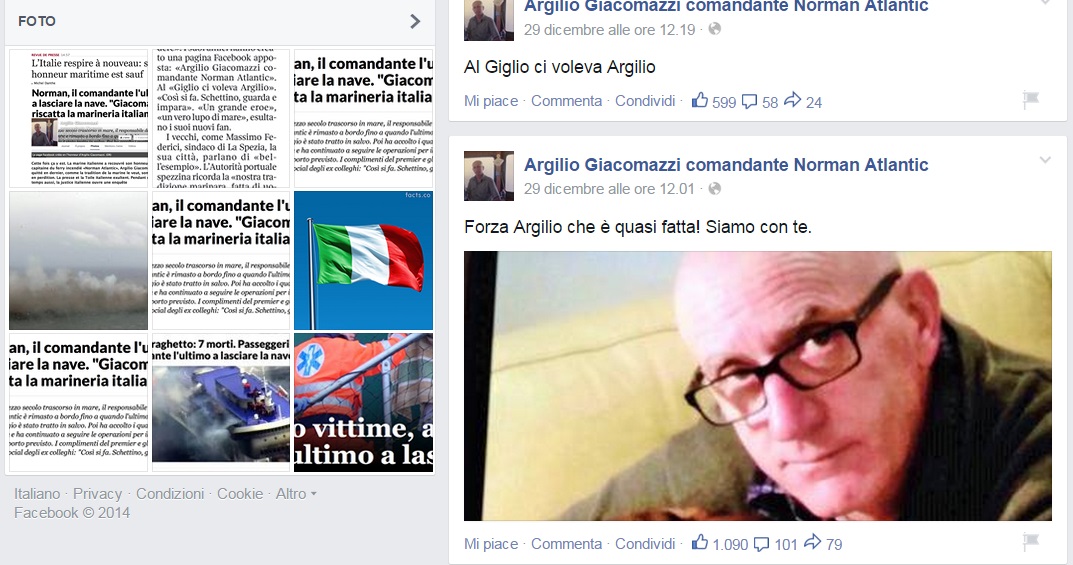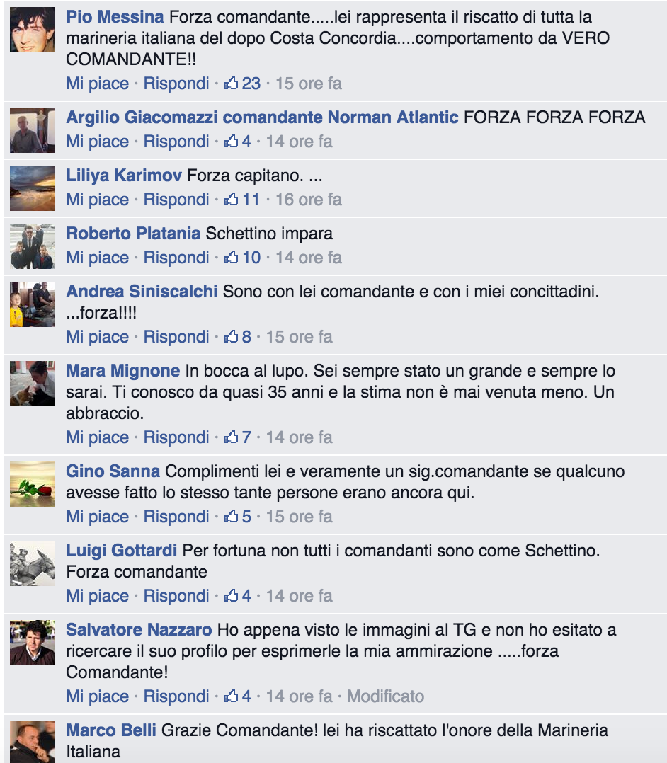 All’indomani dell’incidente sulla pagina Facebook dedicata a lui fioccano i commenti positivi, con tanti riferimenti (in negativo) al comandante della Costa Concordia.