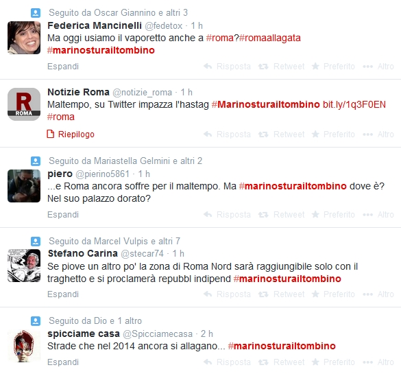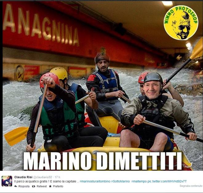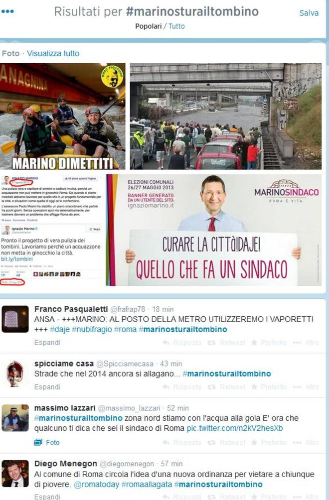 “«#marinosturailtombino: zona nord stiamo con l’acqua alla gola E’ ora che qualcuno ti dica che sei il sindaco di Roma», si sfoga Massimo lazzari. E scherza Diego Menegon: «Al comune di Roma circola l’idea d’una nuova ordinanza per vietare a chiunque di piovere». Immagini di strade allagate, inondazioni. «Venezia? No Roma, fermata metro Anagnina… Le rapide….del sindaco»”