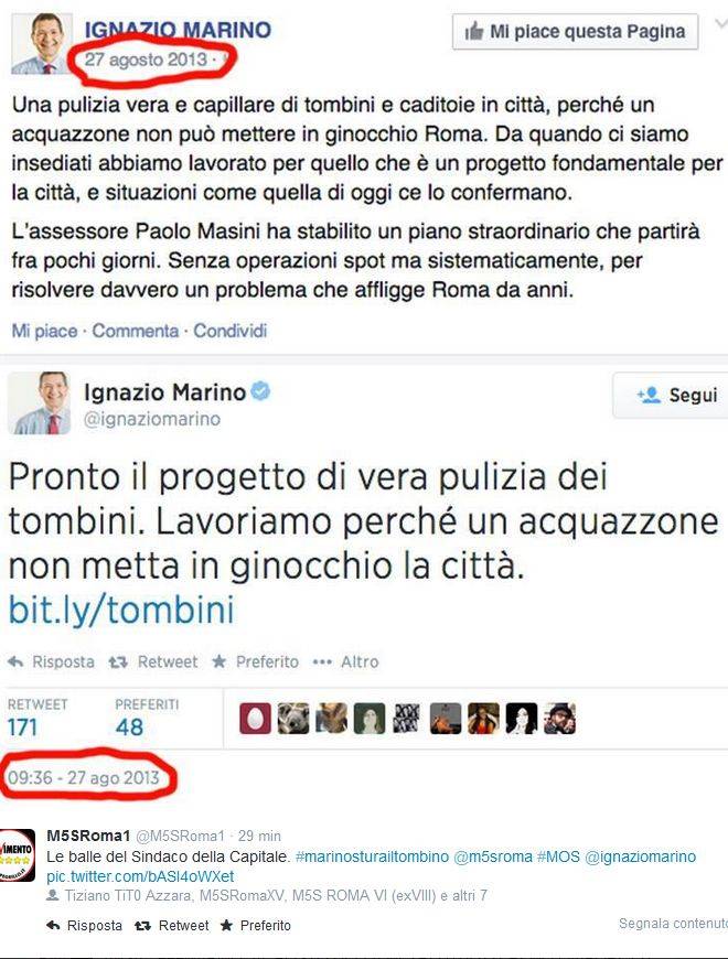 “«Marino: al posto della metro utilizzeremo i vaporetti+++, #daje #nubifragio #roma #marinosturailtombino»; «Strade che nel 2014 ancora si allagano… #marinosturailtombino», scrive spicciame casa”.