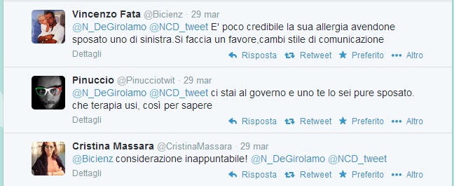 ROMA – “Ncd allergici alla sinistra”. Nunzia De Girolamo lo scrive su Twitter e gli altri utenti le ricordano che ne ha sposato uno. La De Girolamo, Ncd, è sposata a Francesco Boccia, esponente del Pd. E così la sua affermazione di “allergia” fa scattare l’ironia sul social network.