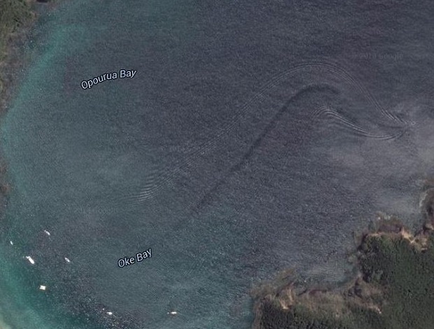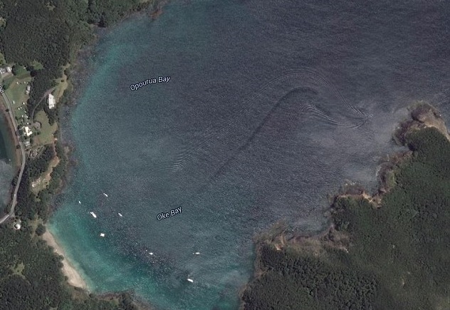 Si tratta di Oke Bay nella Bay of Islands, area della costa est del Far North District. L’avvistamento sarebbe avvenuto attraverso una scia inspiegabile avvistata grazie a Google Earth.