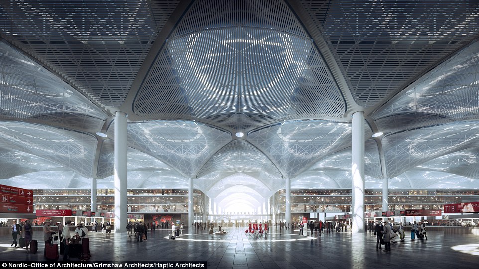 Finora, il nome è “Istanbul New Airport”, il nuovo aeroporto di Istanbul. Servirà la Tuchira come aeroporto primario e da centro connettivo per i voli tra Europa ed Asia. Come aeroporto del futuro, si semplificheranno i flussi di passeggeri con terminal più spaziosi, distanze a piedi più confortevoli e nuove tecnologie. Il Terminal 1 avrà un soffitto a volta , lucernari che forniscono luce naturale e un tetto a doghe che emana una gamma di colori blu e un disegno geometrico discreto.