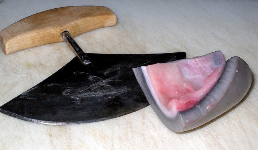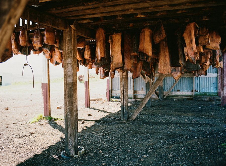 Hàkarl, Islanda. In passato le acque del luogo erano popolate da squali polari, la cui carne però non era buona da mangiare a causa dell’alto contenuto di acidi urici. Per questo motivo gli squali catturati venivano sfilettati e appesi sotto una collinetta di pietre per un paio di mesi, durante i quali perdevano l’urina e gli altri acidi urici. Poi venivano lasciati ancora per 2-4 mesi all’aria aperta. Vengono preparati esattamente allo stesso modo anche in Islanda; ma ora si possono giustificare solo come rispetto per la tradizione, visto che sia il gusto che l’odore del piatto ricordano lo squalo putrefatto