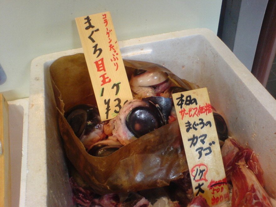 “Occhi di tonno, Giappone. Oltre al sushi, in Giappone si possono gustare gli occhi di tonno già cucinati, in umido o leggermente scottati. Sotto un involucro “gommoso” si trova una sostanza morbida e grassa, il cui gusto ricorda quello dei calamari o del polpo