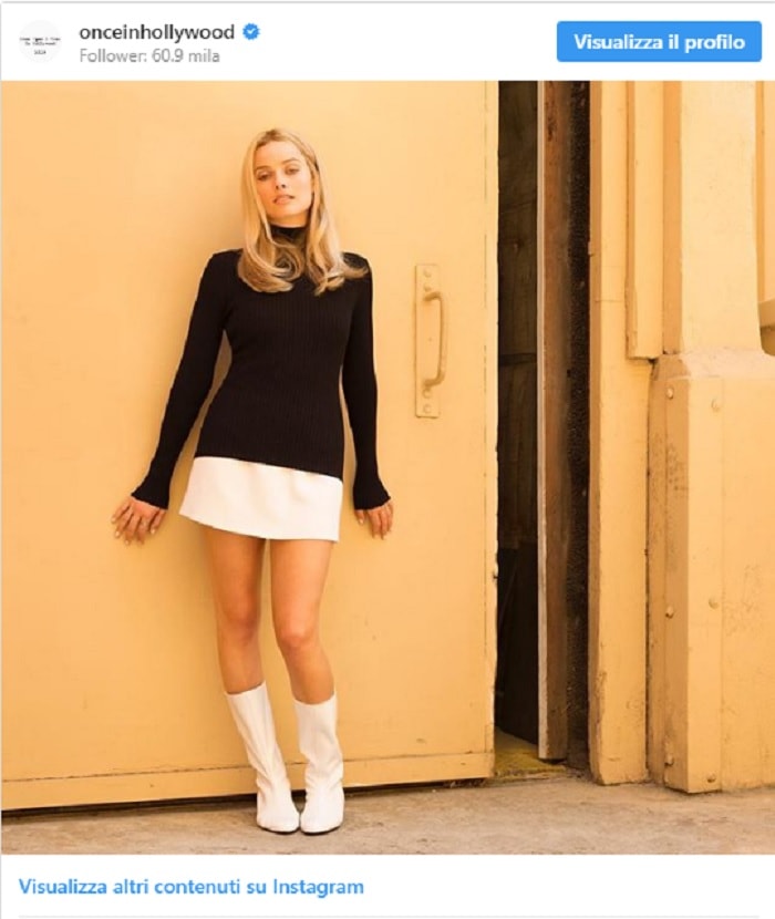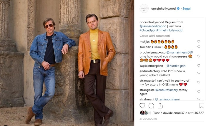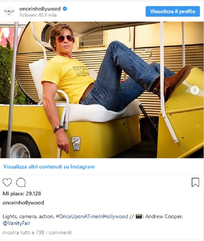 DiCaprio interpreta invece Rick Dalton, una ex star delle serie tv western: nella foto diffusa in rete sta saltando su un furgone ed ha un fucile in mano. Nello scatto diffuso sette mesi fa, l’attore 44enne appariva con un dolcevita giallo ed una giacca di pelle marrone. Nella stessa foto c’era anche Brad Pitt, che nel film interpreta Cliff Booth, uno stuntman amico di Dalton. Nello scatto di giugno indossa giacca di jeans e mocassini. Nella foto diffusa ora, appare invece sdraiato su una golf car giallo brillante, indossa una t-shirt gialla e jeans.