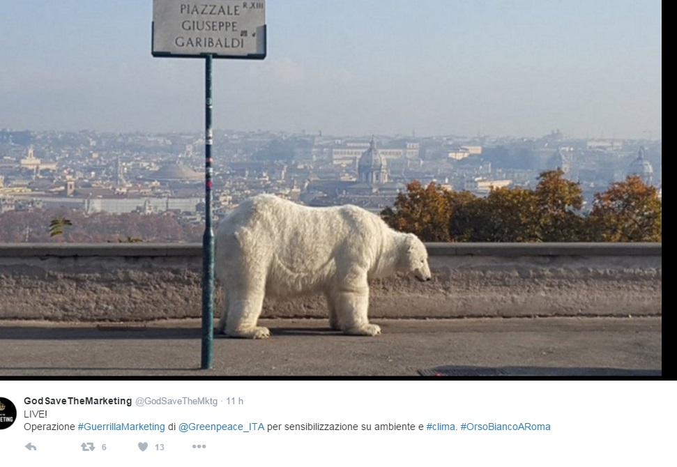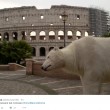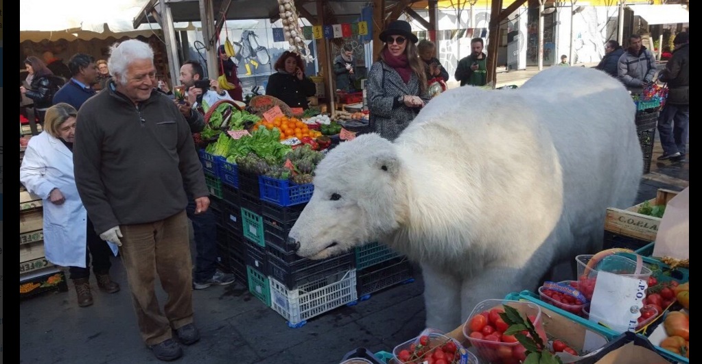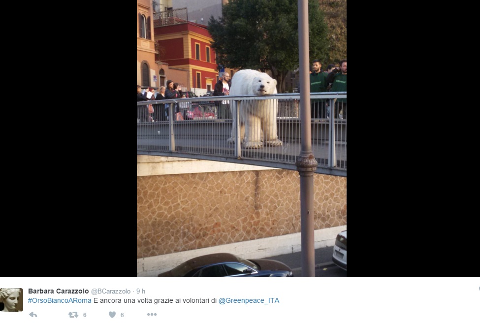 ROMA – Se vi trovate a Roma potreste avvistare un orso polare “in giro” nei pressi di luoghi storici come il Fontanone del Gianicolo o sulle banchine del Tevere. Si tratta di un esemplare finto, utilizzato da Greenpeace come testimonial di un’iniziativa che ha a che vedere con la conferenza Onu per il clima in corso a Parigi. L’orso servirebbe a sensibilizzare l’opinione pubblica sugli effetti dei cambiamenti climatici come a voler dire: i ghiacciai si sciolgono, bisogna intervenire prima di vedere davvero un orso polare a passeggio per le strade di Roma.