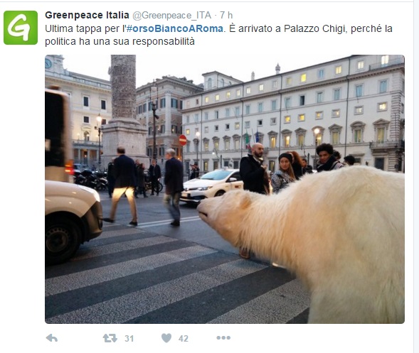 “Anche in Italia un orso polare ha fatto la sua apparizione questa mattina a Roma, in Piazza San Pietro. Mentre a Rio de Janeiro, l’orso polare più grande al mondo – una mongolfiera di 12 metri – ha dato inizio alla campagna volando di fronte alla statua del Cristo Redentore.”