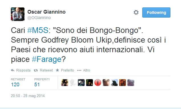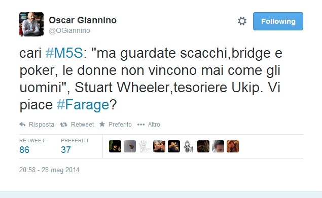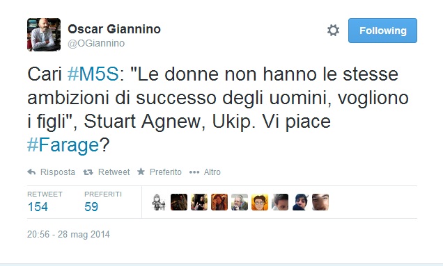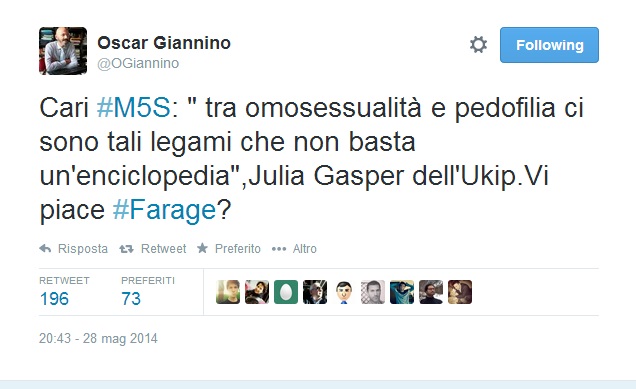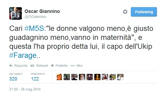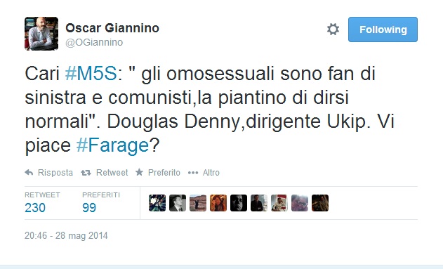 “Niente probabilmente” risponde via Twitter Giannino che poi su Twitter pubblica alcune frasiย in ordine sparsoย dei dirigenti dell’Ukip, Farage incluso: “Le donne valgono meno,รจ giusto guadagnino meno,vanno in maternitร ”, “Le donne non hanno le stesse ambizioni di successo degli uomini”, “Gli omosessuali sono fan di sinistra e comunisti, la piantino di dirsi normali”, “Tra omosessualitร e pedofilia ci sono tali legami che non basta un’enciclopedia”.