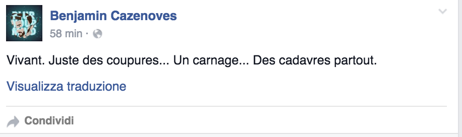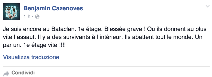 L’uomo, Benjamin Cazenoves, è un giovane designer. Su Facebook ha scritto: “Io sono ancora al Bataclan al 1° piano. Sono ferito gravemente. Vengano ad aiutarci. Ci sono dei sopravvissuti all interno. Stanno colpendo tutti, uno per uno. Al 1° piano in fretta”.