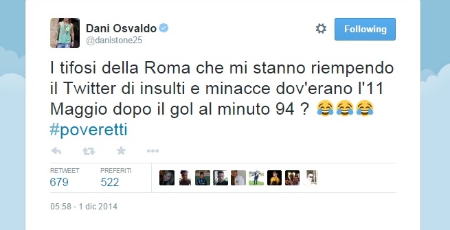 Osvaldo non ha mostrato questa maglietta celebrativa ma ha provocato via Twitter i tifosi della Roma.Â