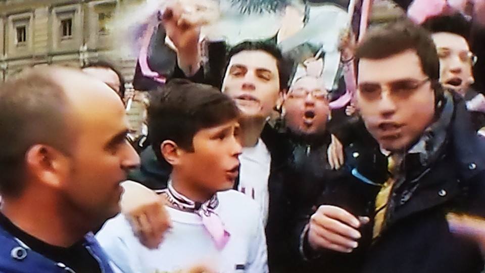 La gente raggiunge la piazza a piedi, in auto e in moto. Sventolano le bandiere e le sciarpe in un tripudio di colori rosanero, il frastuono dei clacson per le strade è assordante.