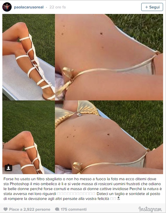 ROMA – Paola Caruso posta delle foto su Instasgram in cui appare senza ombelico. Così pare almeno guardando le foto postate su Instagram. La bonas di “Avanti un altro” e concorrente all’Isola dei Famosi 2016, nonché ex fidanzata di Luca Bonolis, è stata fotografata su Instagram con bikini dorato, sandali bianchi, occhiali da sole su un lettino in una località di volleggiatura. Il web non le ha perdonato la mancanza dell’ombelico: “La nuova moda di non avere l’ombellico” commenta un’utente su Instagram, acui altri aggiunfono frasi del tipo “viva il Photoshop” consigliandole di fare un corso approfondito per imparare ad utilizzare il programma. Le critiche hanno subito portato i sostenitori di Paola a rispondere spiegando che si tratterebbe solo di critiche nate per l’invidia ad un fisico perfetto.
