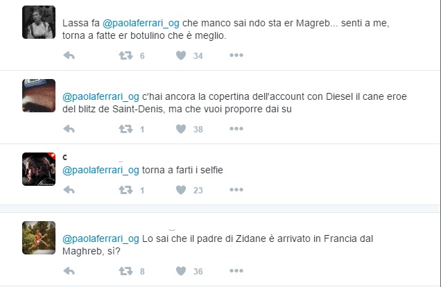 Gli utenti di Twitter non restano indifferenti ai cinguettii di Paola Ferrari e si scatenano commentando con ironia, chiedendole cosa pensa di fare con i calciatori originari del Magreb e chiedendosi se la giornalista sappia effettivamente di cosa stia parlando: